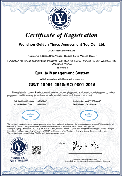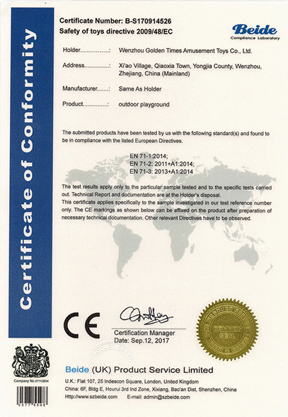 As the member of CHINA TOY ASSOCIATION, our factory had drafted below standards of playground equipment in china: GB/T 27689-2011(No power type of amusement devices—Children slide), GB/T 28622-2012(No power type of amusement devices – Terminology), GB/T 28711-2012 (No power type of amusement devices. Swing). Also we have got the ISO9001,ISO18001,ISO14001 and CE EN-1176 certificate.