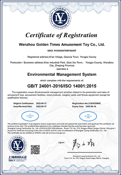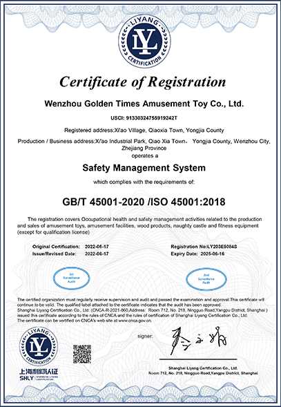 The company is a member of the China Toy Association. We strive to innovate, continuously introduce first-class equipment, process technology and advanced management concepts from home and abroad, and establish standardized production processes through standard certification systems. We have successively obtained IS09001 quality management system certification and ISO140010 environmental management system certification. ISO180011 occupational health and safety management system certification, EU General Electric, SGS, TUT certification and many other certifications. The company has successively obtained the A-level reputation of industrial and commercial enterprises in Zhejiang Province. We chose to withdraw from national credit and participated in the drafting of non-powered entertainment equipment.